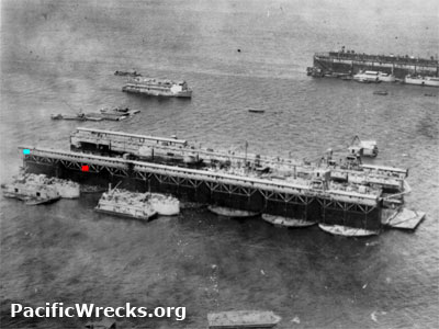 Ira Lefkowitz caption: "Here is an aerial view of the ABSD 2 & 4. In the foreground is USS ABSD-4 the 'x' marks just about where the torpedo hit. I sleep about where the 'o' is. See the barracks? If you will look closely you will see that the outer dock does not have them."