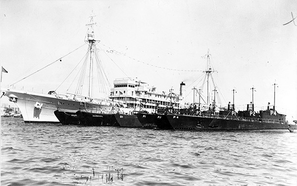 (Left to right) USS Holland (AS-3) with submarines USS Nautilus (SS-168); USS Narwhal (SS-167); USS Shark (SS-174), marked P3; USS Dolphin (SS-169), marked D1; USS Porpoise (SS-172), marked P1; USS Pike (SS-173), marked P2; and USS Tarpon (SS-175), marked P4. Credit: USN via NHHC NH-3038 Date: circa 1936–1939